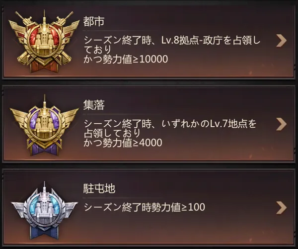Section titled “勢力の戦績レベル”勢力の成績には都市、集落、駐屯地の3つのランクがあります。さらにそれぞれのランクの中で勢力値に応じて3段階があります。